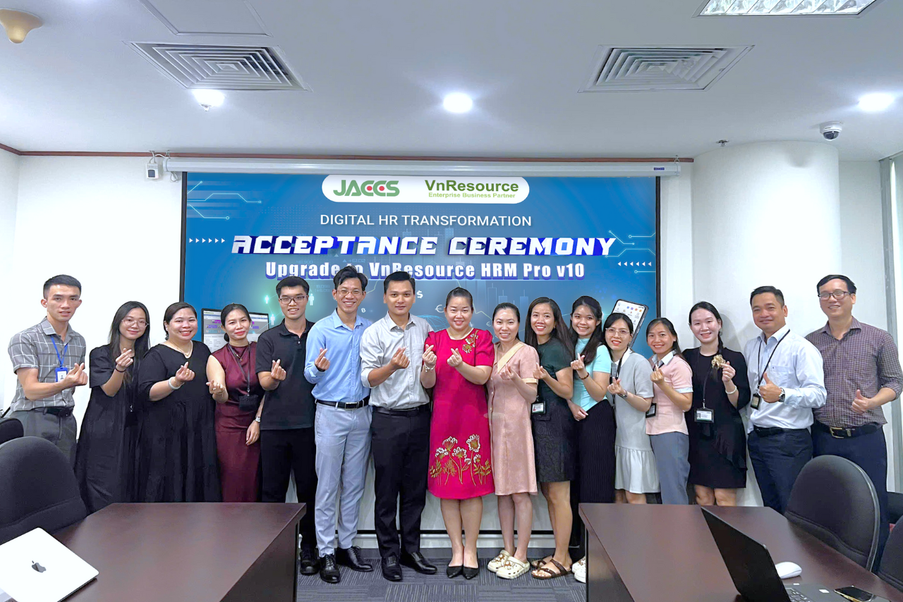 Ngày 16/09/2025, Công ty Tài chính Quốc tế Việt Nam JACCS và VnResource đã tổ chức thành công lễ nghiệm thu dự án nâng cấp phần mềm quản trị nhân sự VnResource AI HRM v10. Đây là dấu mốc quan trọng, khẳng định sự đồng hành hiệu quả và bền vững giữa hai bên trong hành trình chuyển đổi số toàn diện tại JACCS.