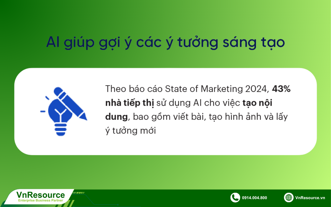 Theo báo cáo “State of Marketing 2024” của HubSpot, 43% marketer đang sử dụng AI trong sáng tạo nội dung – từ viết bài, lên ý tưởng video cho đến tạo hình ảnh. Điều này không có nghĩa AI thay thế con người, mà là AI mở rộng khả năng sáng tạo của đội ngũ, giúp họ vượt qua giới hạn tư duy thông thường và tiếp cận những góc nhìn mới mẻ hơn.