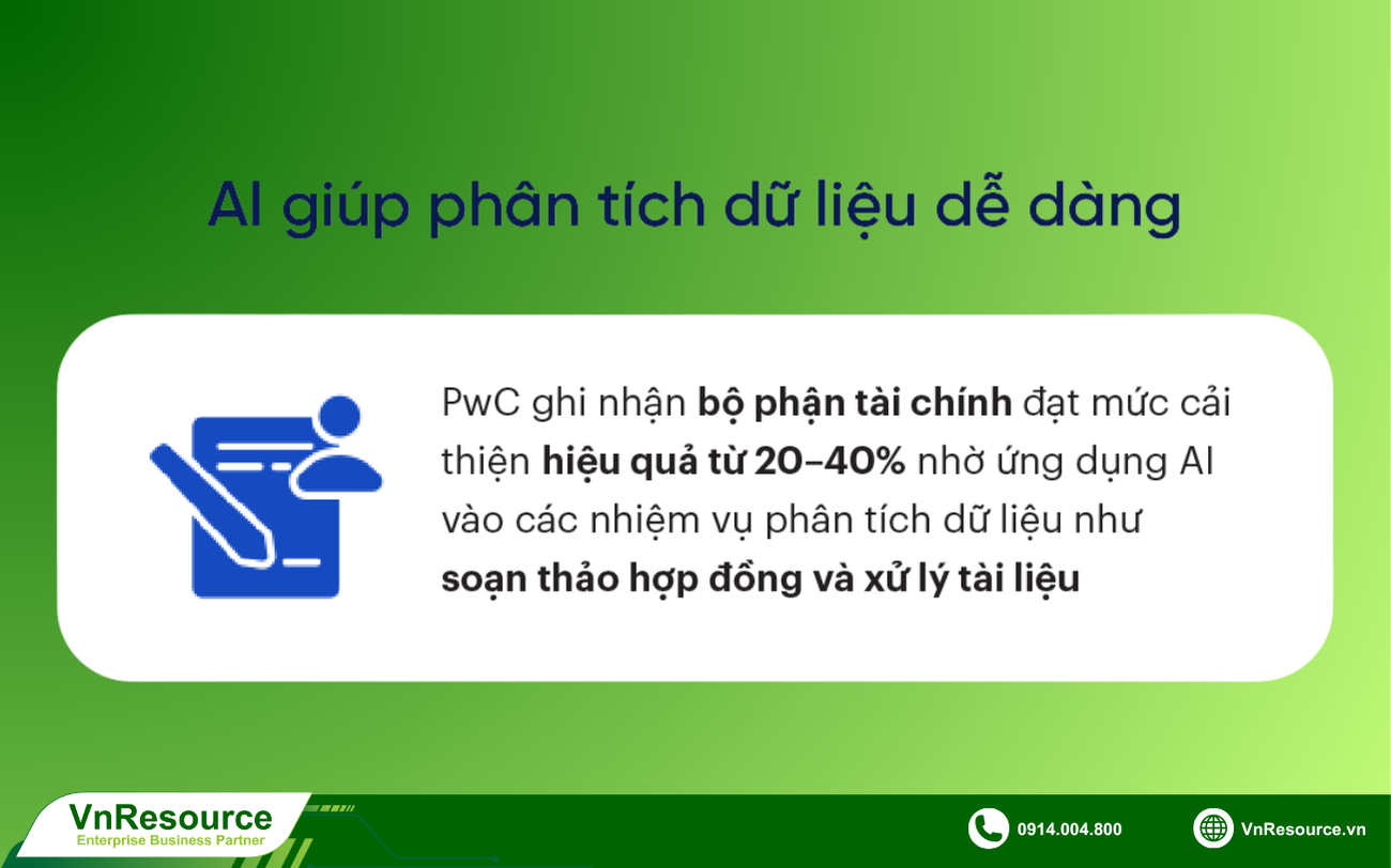 Theo khảo sát của PwC, bộ phận tài chính tại các công ty ứng dụng AI đã đạt mức tăng hiệu quả từ 20–40%, đặc biệt trong các hoạt động như: Soạn thảo hợp đồng, phân tích bảng cân đối tài chính, tự động hóa quy trình xử lý tài liệu. Nhờ đó, thời gian ra quyết định được rút ngắn, sai sót giảm và độ chính xác được nâng cao đáng kể.