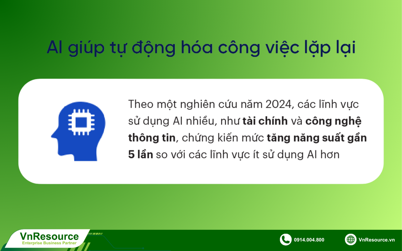 Một nghiên cứu của PwC năm 2024 cho thấy, các ngành nghề ứng dụng AI mạnh mẽ như dịch vụ tài chính và công nghệ thông tin đã đạt mức tăng năng suất gần gấp 5 lần so với những lĩnh vực ít sử dụng AI như xây dựng hay bán lẻ. Điều này phản ánh rõ ràng tiềm năng của AI trong việc nâng cao hiệu suất làm việc và giảm thiểu thời gian dành cho các công việc hành chính, đặc biệt là với các doanh nghiệp vừa và nhỏ đang cần tối ưu nguồn lực để phát triển.