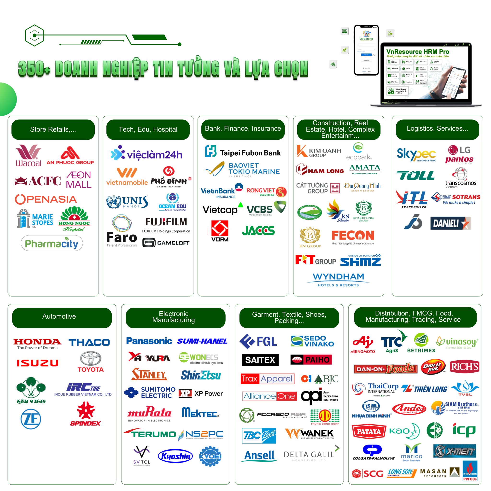 𝐕𝐧𝐑𝐞𝐬𝐨𝐮𝐫𝐜𝐞 với sứ mệnh cung cấp các giải pháp quản trị nguồn nhân lực, văn phòng số giúp doanh nghiệp quản trị hiệu quả và phát triển bền vững. Chúng tôi với 20 năm kinh nghiệm đã tham gia tư vấn, triển khai cho hơn 350 tổ chức/doanh nghiệp hàng đầu trong cả nước như: Tập đoàn Thaco, Honda, Toyota, Panasonic, Tập đoàn Nam Long, Thiên Long, An Phước, Vinasoy, Ajinomoto, Vietnamobile, Pharmacity, Aeon Mall, TTC Agris,… VnResource sẽ là người bạn đồng hành và góp phần thúc đẩy vào sự thành công trong hành trình chuyển đối số của Quý Khách hàng.