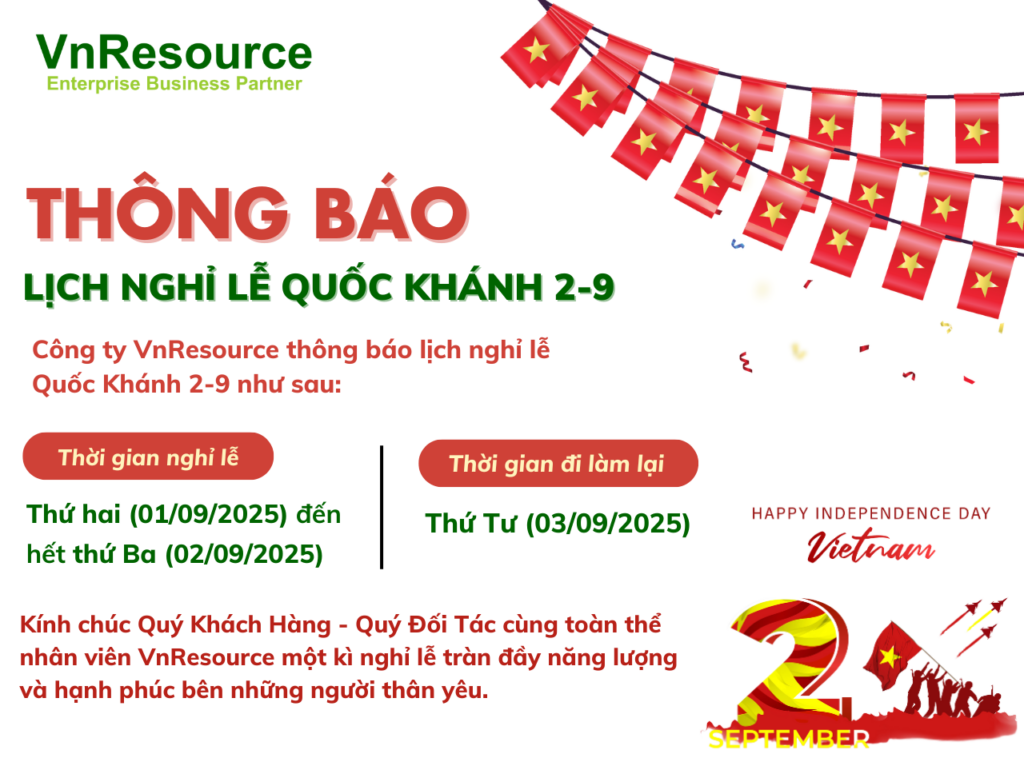 Hòa chung không khí hân hoan của cả nước chào mừng kỷ niệm 80 năm Ngày Quốc khánh Nước Cộng hòa Xã hội Chủ nghĩa Việt Nam (02/09/1945 – 02/09/2025), Công ty Cổ phần Tài nguyên Tri thức Việt Năng (VnResource) xin trân trọng thông báo lịch nghỉ lễ tới Quý Khách hàng, Quý Đối tác và toàn thể Cán bộ nhân viên.